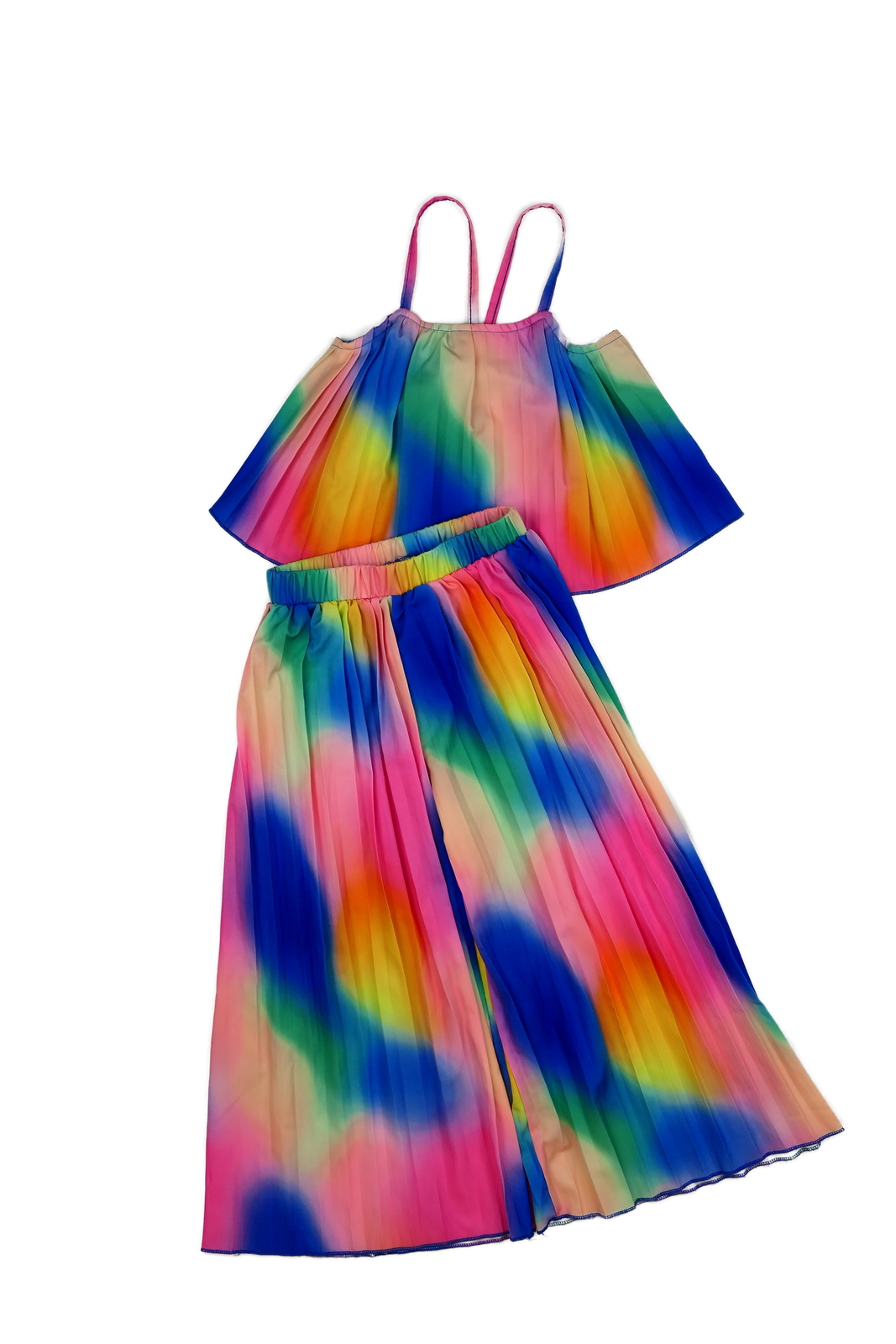 Duhový crop top a široké kalhoty (169 Kč)