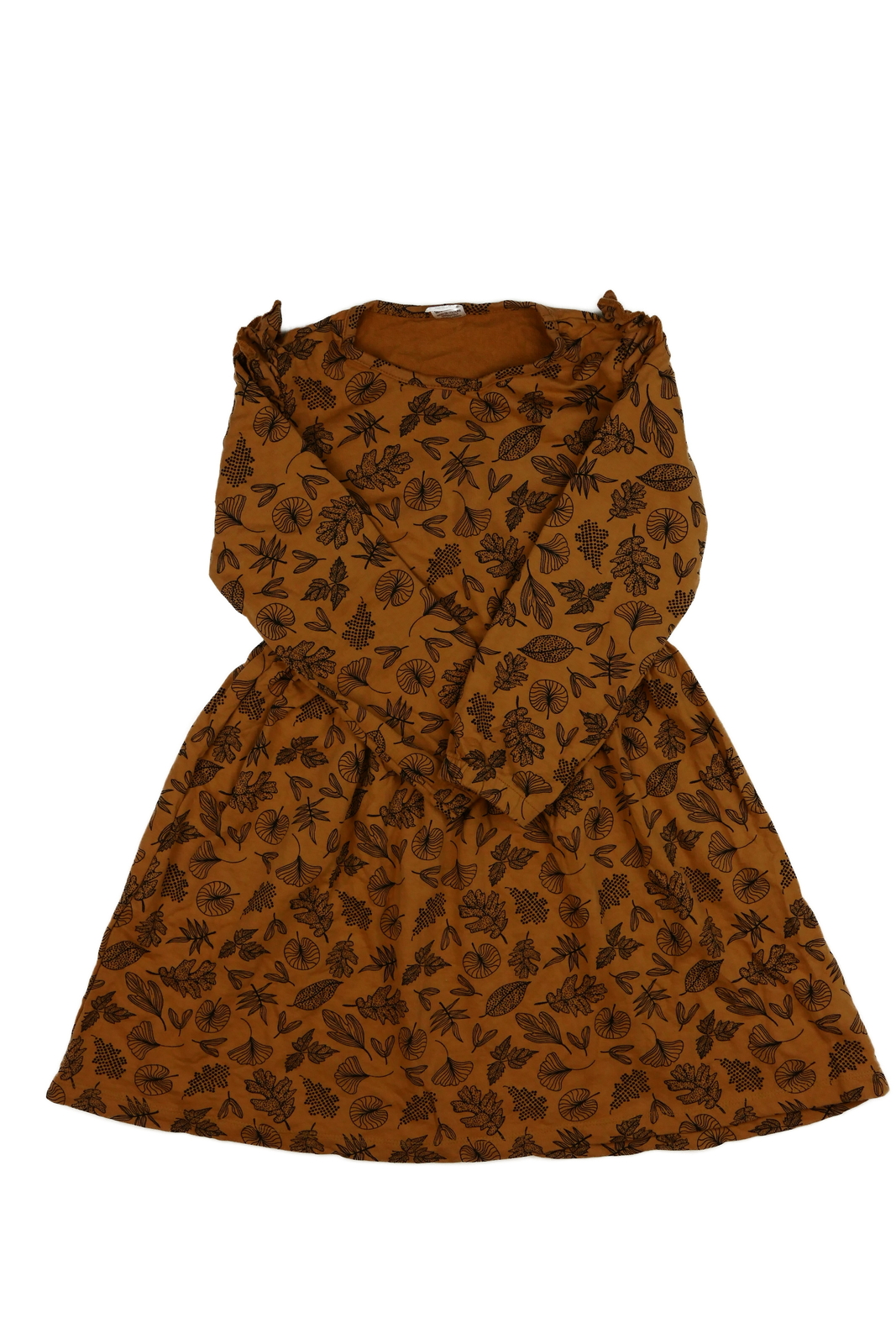 Hnědé šaty s listy a volánky (159 Kč)