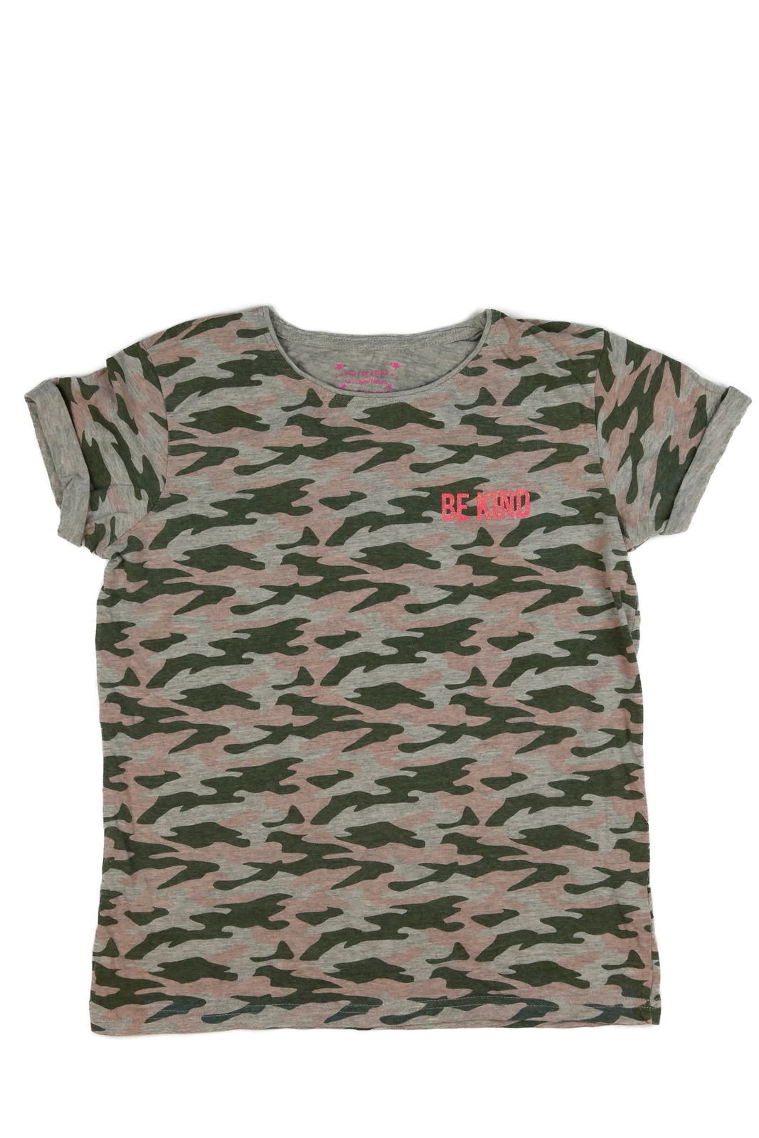 Maskáčové triko s růžovým nápisem Primark (109 Kč)