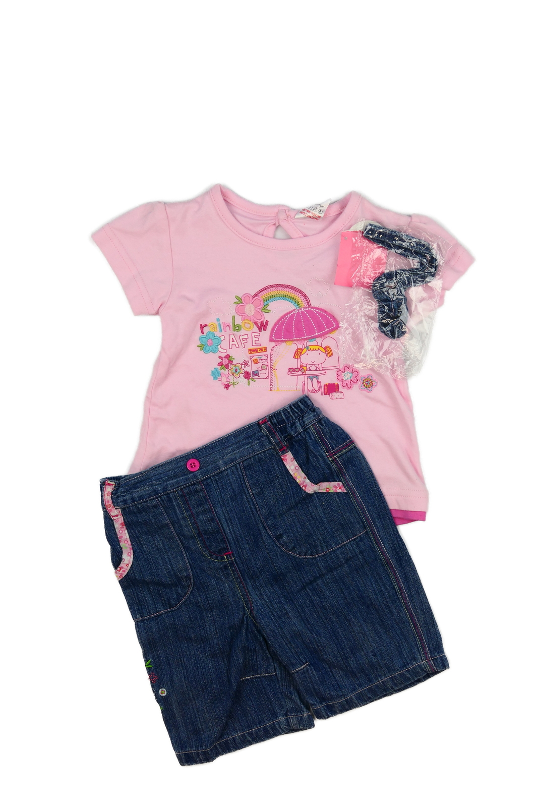 Nové růžové triko, modré kalhoty a čelenka (129 Kč)