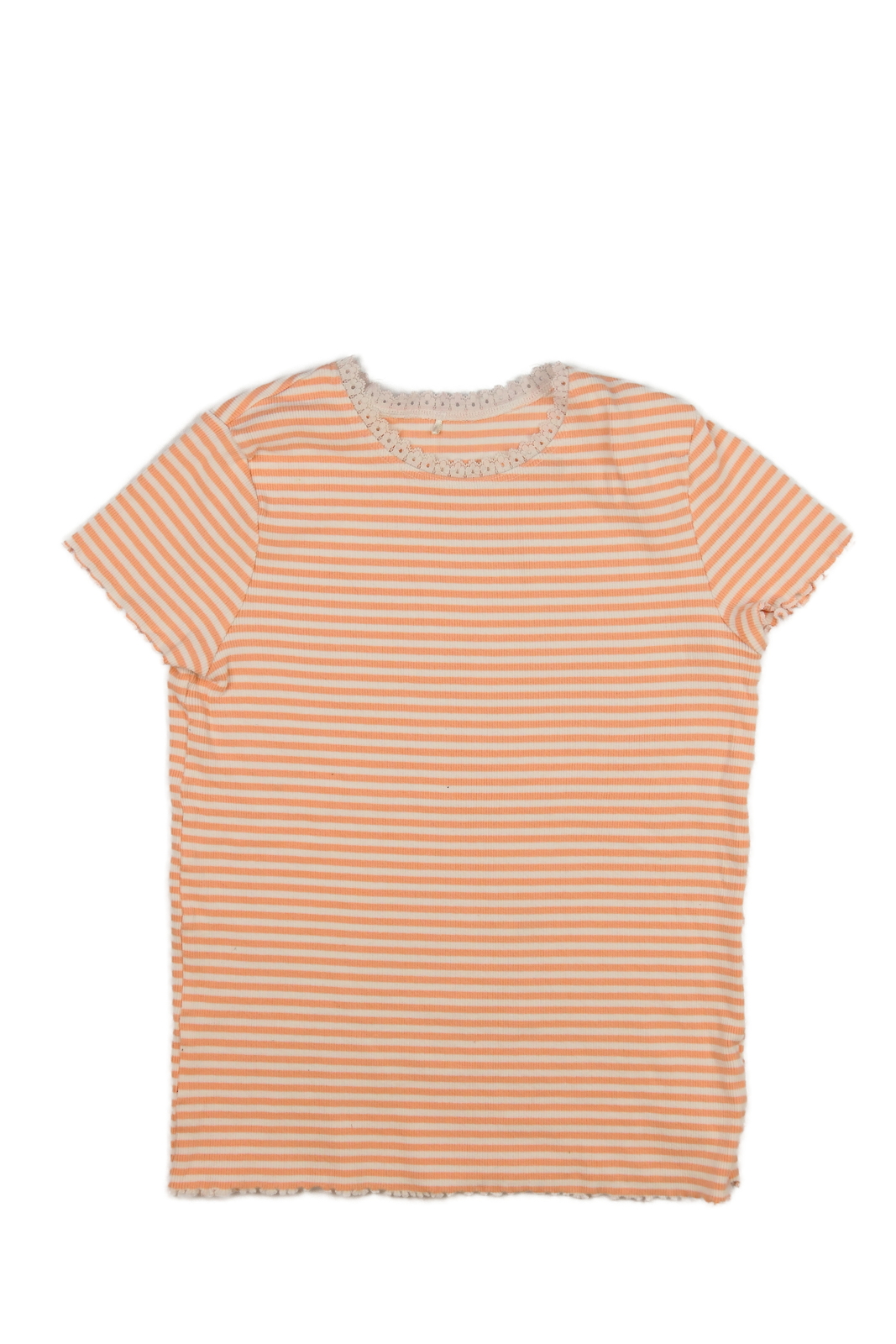 Oranžovo-bílé pruhované triko s krajkou (129 Kč)
